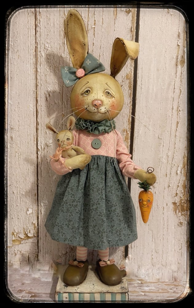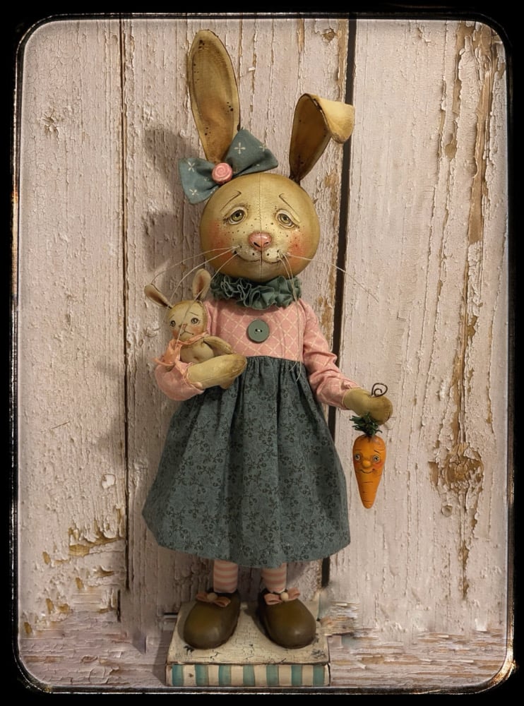 "Bella” the Bunny Rabbit was created from fabric and hand painted. Her ears are wired and can be straightened or posed how you like. She was then dressed in soft pink, amd a dark bluish aqua . She stands at 18". Bella holds a carrot in one hand and her baby bunny in the other all hand made by me. Baby is attatched with thread. Bella’s arms are wired. She permanently stands on her wooden base. She is signed and dated on the bottom of stand.
