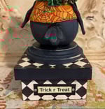 Raven is a fat little bird. It looks like she has plucked the eyeball from someone or some thing. I created Raven from a pattern I created, fabric and painted her. She also contains fabrics and other embellishments. Her beak was made from paper clay. Raven has a cute lil tail attatched. She is perched on top of a wooden box that I have decapauged, she can either be placed on the box or removed, however you like her. Her wings have been wired and are button jointed and moveable. Raven would be shipped as soon as possible priority mail with insurance as it is getting close to Halloween. She measures 10 inches tall on wooden box and 8 inches tall alone. she will come signed and dated.
