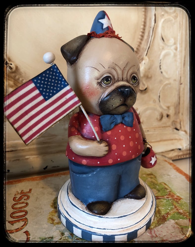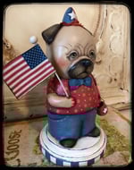 "Percy" the Pug was created from creative paperclay. He is short but fat and 7.5” tall. Percy loves Americana and carries the flag and a container of bones . A fabric bow tie adorns his neck. He comes signed and dated by me.
