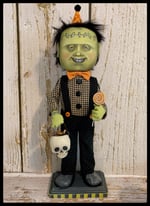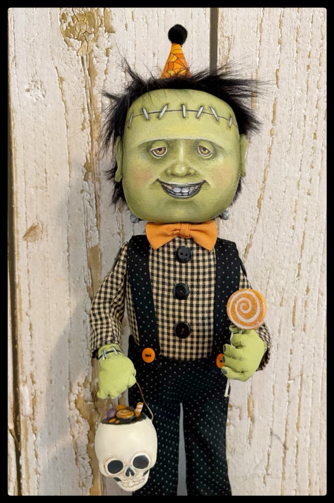 Frankie Lee is all ready for trick-or-treating with his bag and his lollipop. He was created from fabric and hand painted. He permanently stands on a Wooden stand.