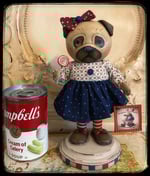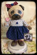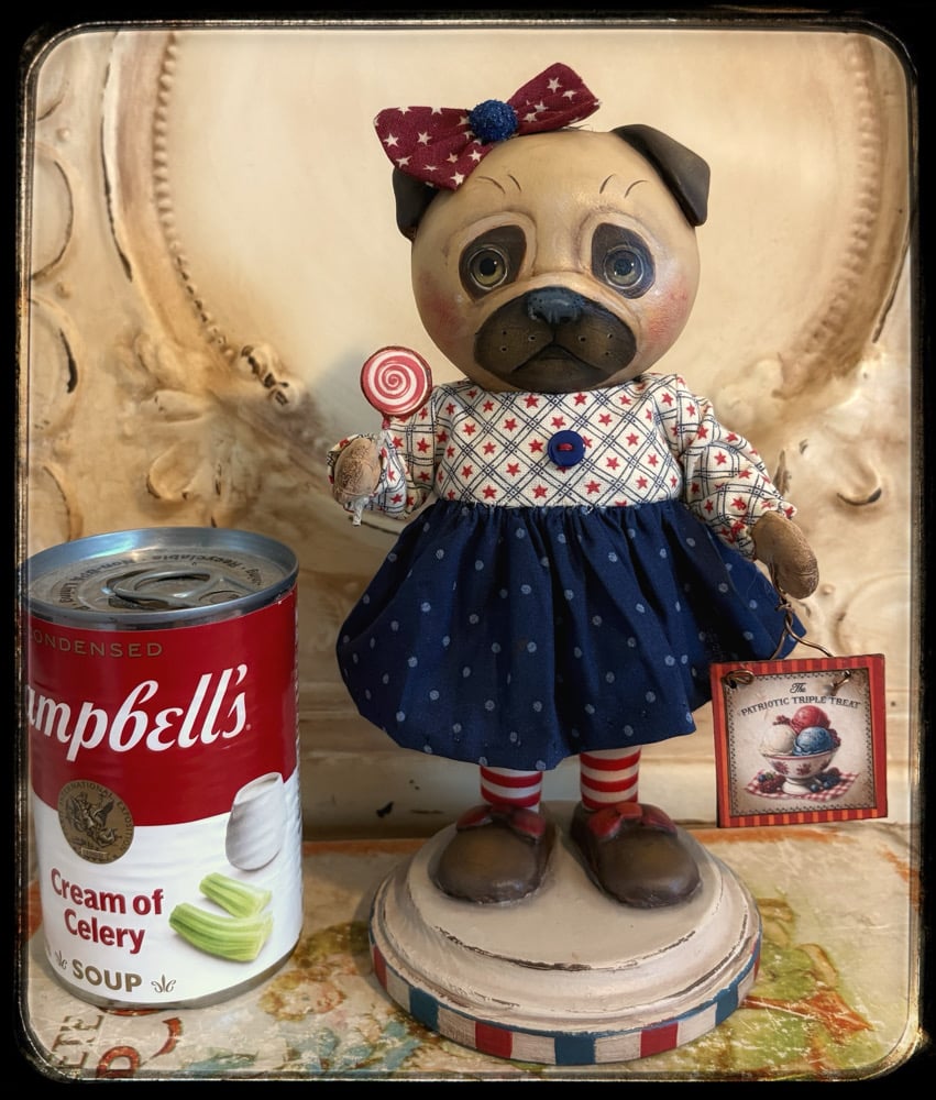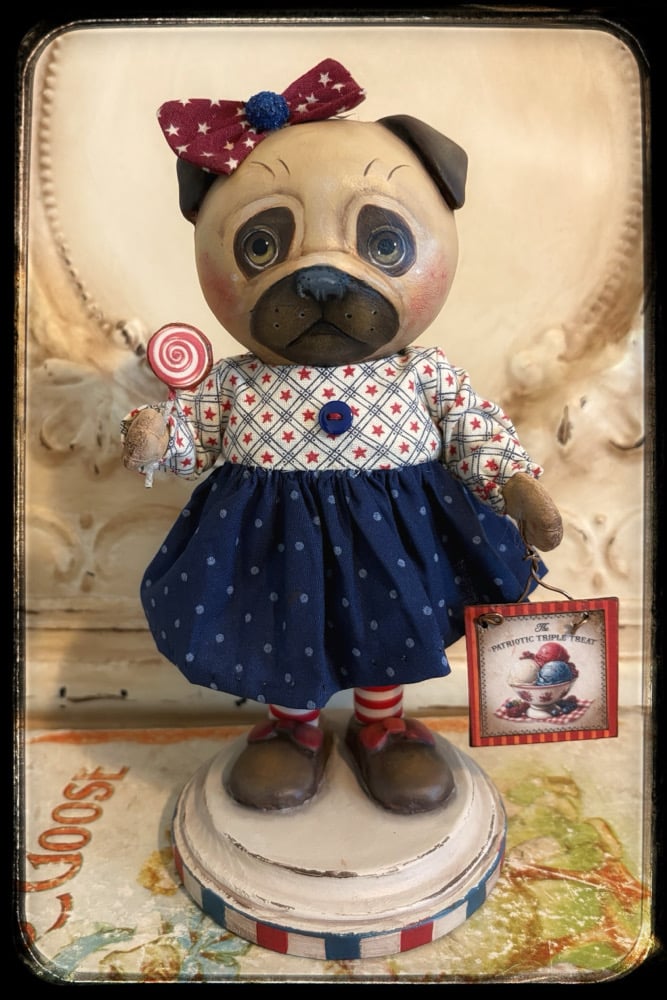 Patty, the patriotic pug was created from a paper clay head that was hand painted. Her body is fabric stuffed. Patty’s arms are fabric and wired for posing. She stands 9 inches tall.