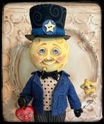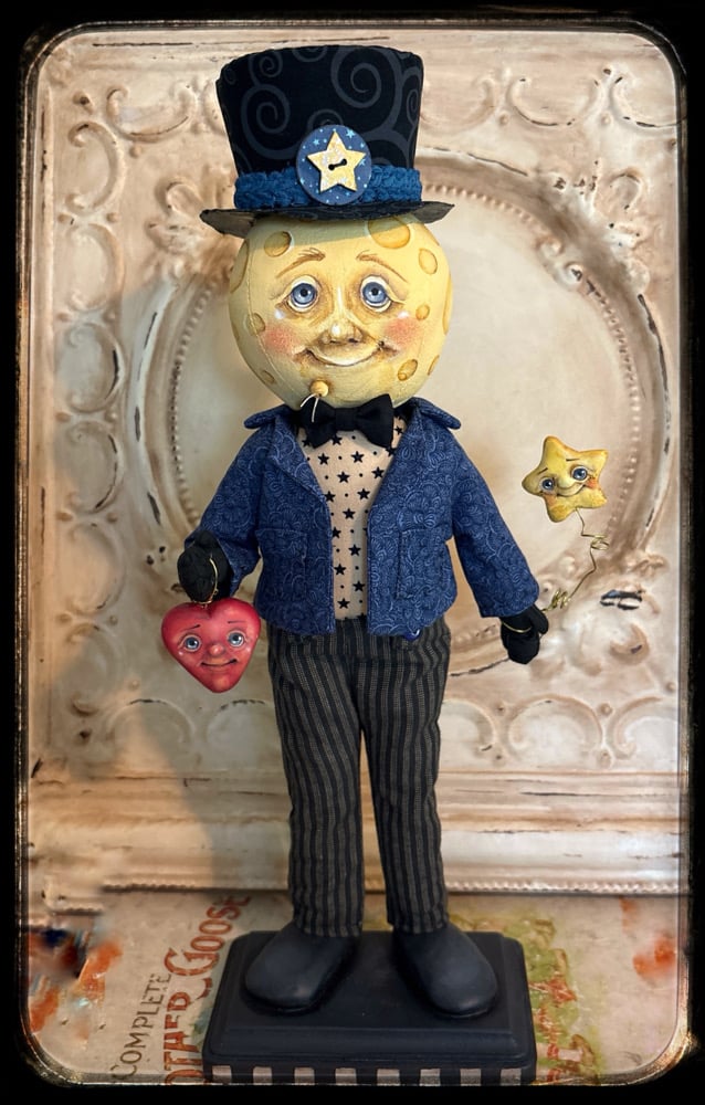 Miles the moon man is 15 inches tall and created from fabrics with a hand painted head. He permanently stands on a wooden stand.