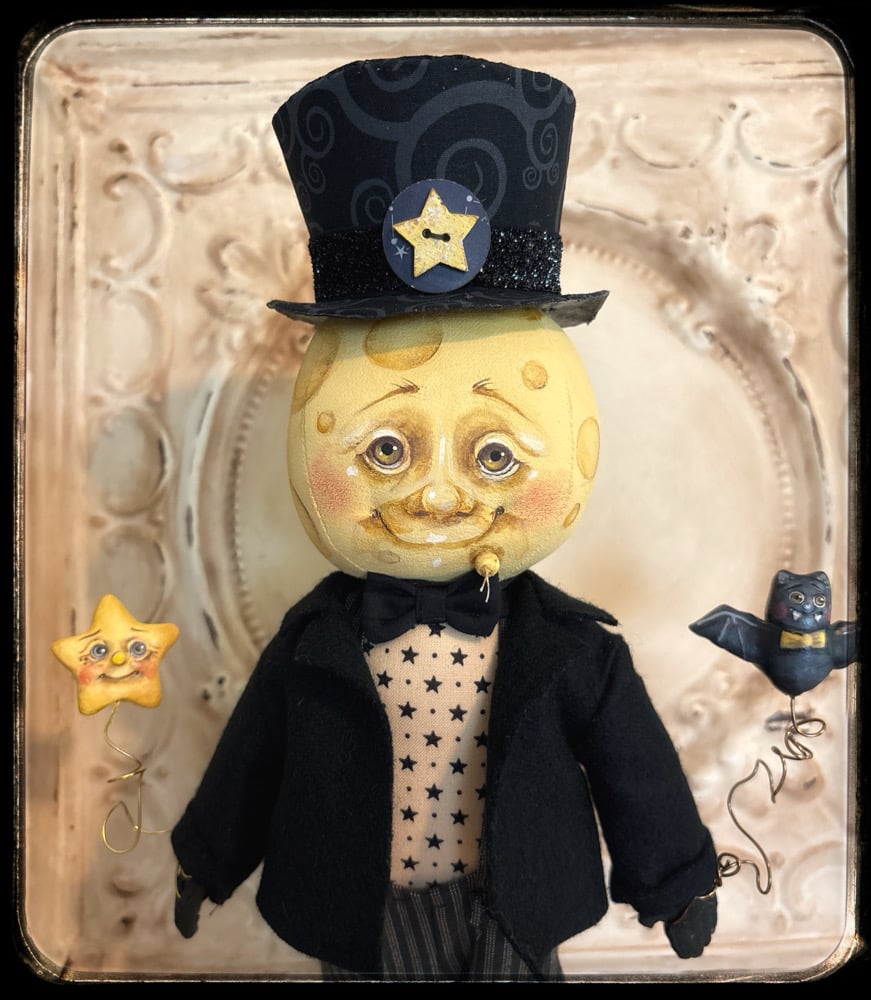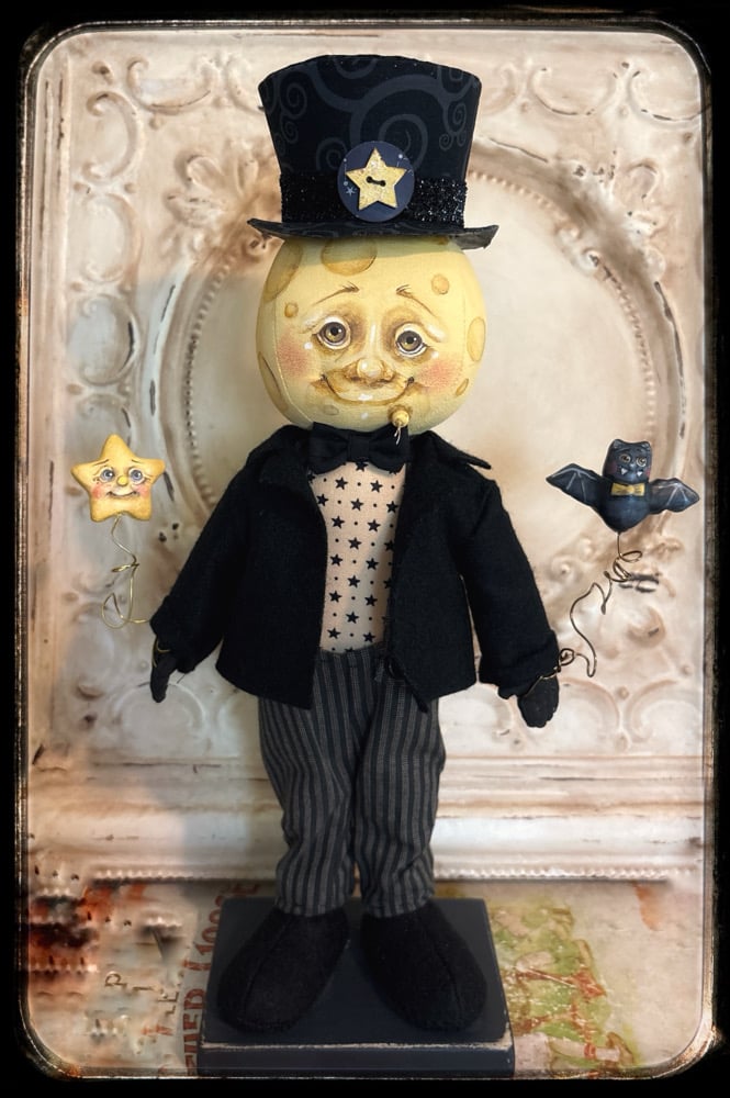 Melvin the Moon man is 15 inches tall and created from fabrics with a wood stand.