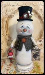 Sawyer the snowman was created from fabric hand painted and glittered with a glitter paint that will not shed. He is 12 inches tall. His colors are kind of a forest green and a rusty red black and off-white. Sawyer will ship on the following day with Insurance