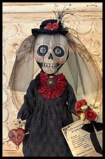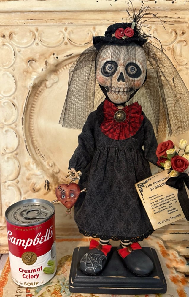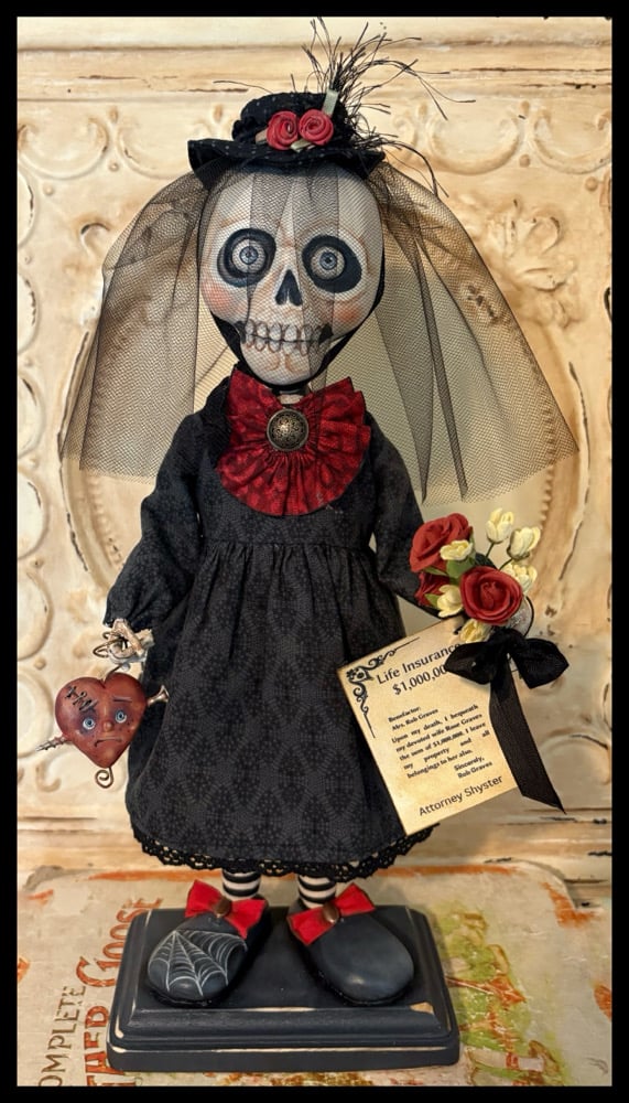 The widows head and torso was created from paper, clay and hand painted her legs are wooden dowels covered in fabric. She stands permanently on a wooden stand. Widow Graves stands inches tall. Her arms are wired and Gently movable. She permanently stands on her wooden base.